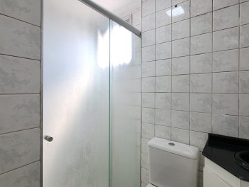 1 Banheiro com armário, box de vidro e ventilação natural.