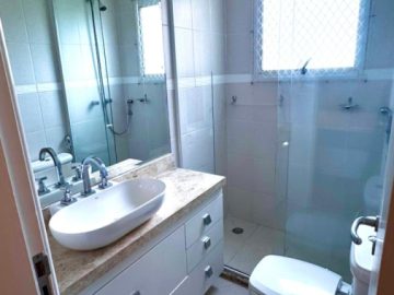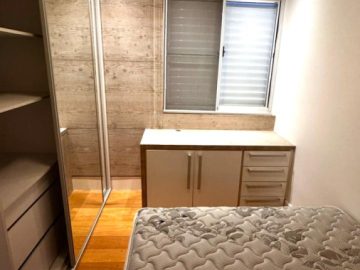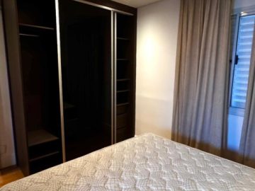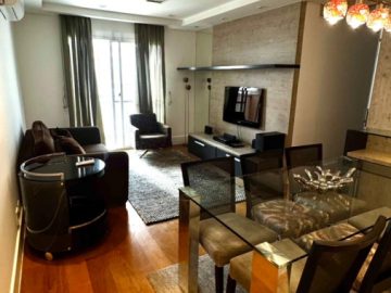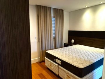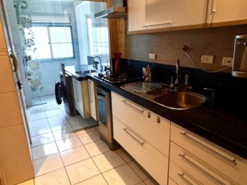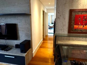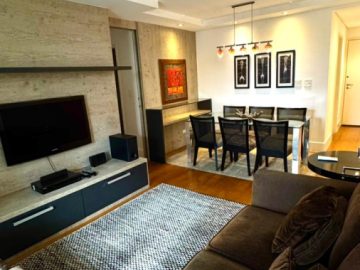 A cozinha planejada está totalmente mobiliada e equipada com eletrodomésticos modernos, em perfeito estado. Há ainda quarto e banheiro de serviço, armários planejados em todos os ambientes, ar-condicionado, piso em taco de madeira e acabamentos em gesso no teto.