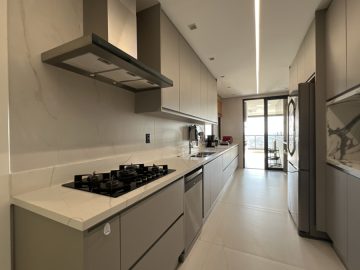 A planta foi projetada para oferecer amplitude e integração, realçando a experiência de morar.
