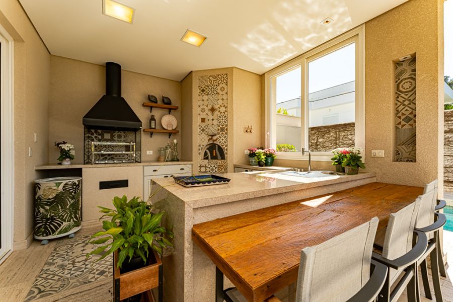 Espaço gourmet com churrasqueira integrado à cozinha