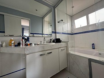 A área social impressiona com um living para vários ambientes, equipado com lareira, jardim de inverno, sala de jantar e um escritório perfeito para home office. A cozinha planejada e funcional oferece praticidade no dia a dia. No piso superior, encontram-se 4 suítes, todas com armários e ar-condicionado. A suíte máster conta com um amplo closet, duas cubas e banheira de hidromassagem, além de uma charmosa sala íntima de TV e copa de apoio, proporcionando um ambiente privativo e acolhedor.