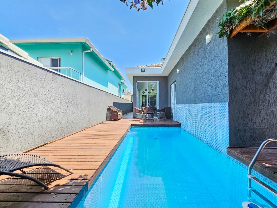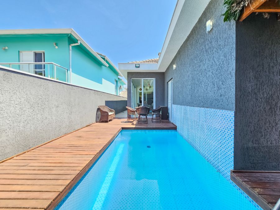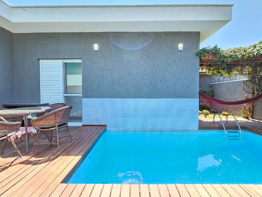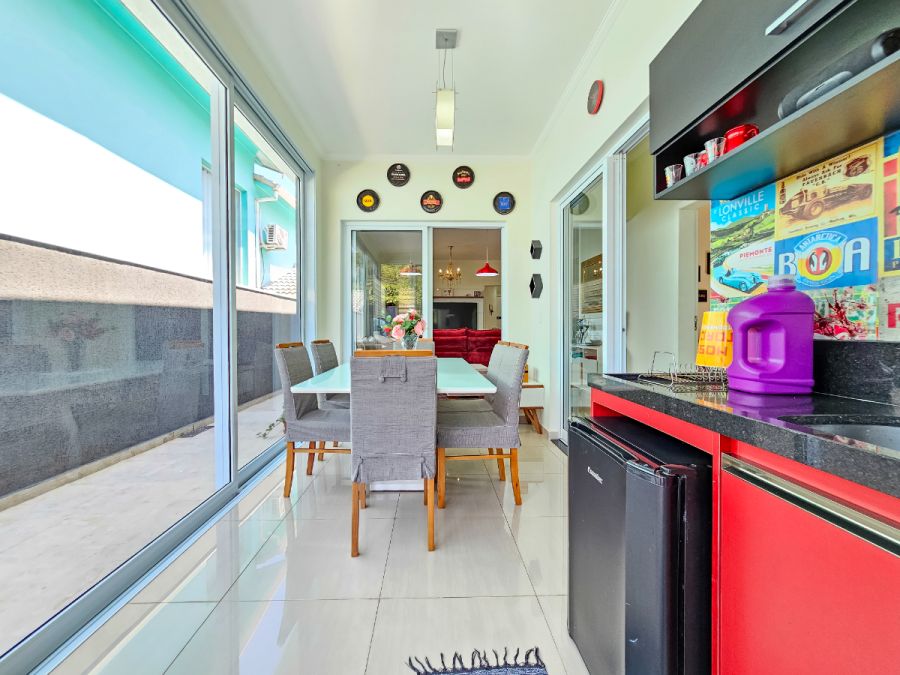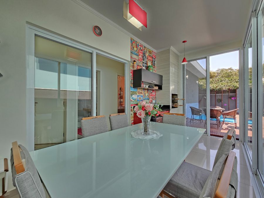 Na área externa, o destaque fica por conta da piscina aquecida com deck e varanda gourmet envidraçada integrada com a sala, perfeitas para momentos de lazer e confraternização durante o ano todo. A casa conta ainda com garagem para 4 veículos, sendo 2 cobertos e 2 descobertos.