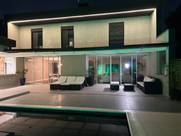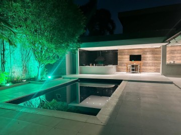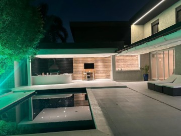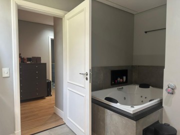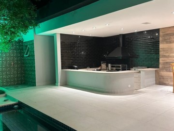 São 5 dormitórios, sendo uma suíte master, com closet grande, banheiro com hidro e 1 suíte comum / 3 dormitórios que divide 1 roupeiro e 1 banheiro / Sala íntima no piso superior / Suíte grande para empregada / Sala de lareira, sala de jantar e sala de tv / Área externa com 2 pias, churrasqueira, chapa, armários, piscina, ducha externa, banheiro e sauna. Possui mais 1 banheiro pra prestadores de serviços, garagem para 4 carros 2 cobertos e 2 descoberto.