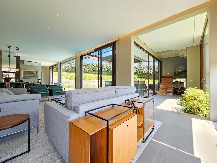O piso térreo é dedicado à convivência e ao entretenimento: as salas de estar e jantar são perfeitamente integradas à cozinha e à área da piscina. Esta integração total garante que a casa esteja sempre cheia de luz natural e com uma circulação suave, ideal para receber.